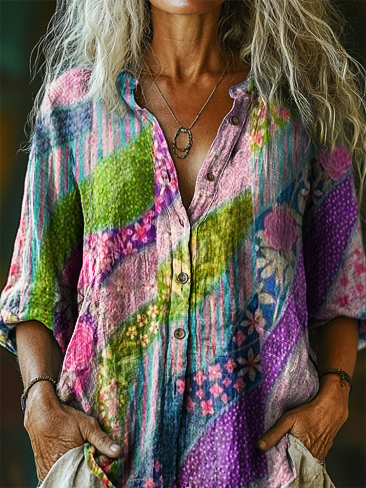 Women's Vintage Ethnic Floral Art Print Casual Cotton Linen Shirt