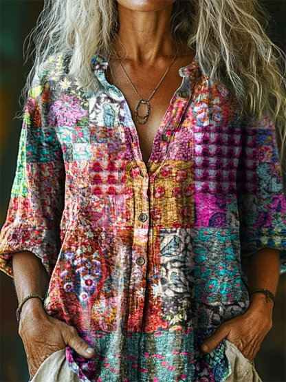 Women's Vintage Ethnic Floral Art Print Casual Cotton Linen Shirt