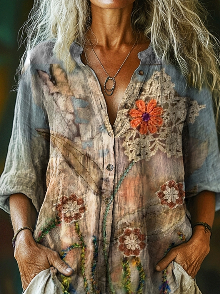 Women's Vintage Ethnic Floral Art Print Casual Cotton Linen Shirt