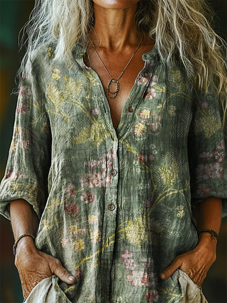 Women's Vintage Ethnic Floral Art Print Casual Cotton Linen Shirt
