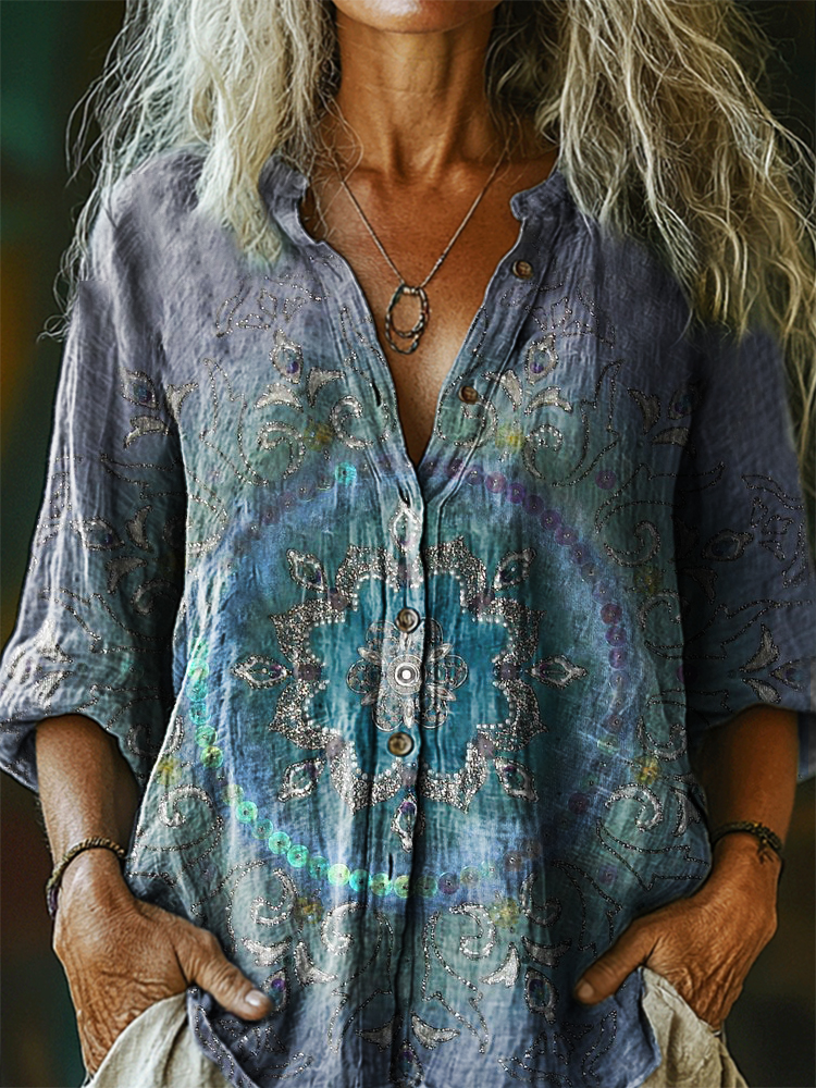 Women's Vintage Ethnic Floral Art Print Casual Cotton Linen Shirt