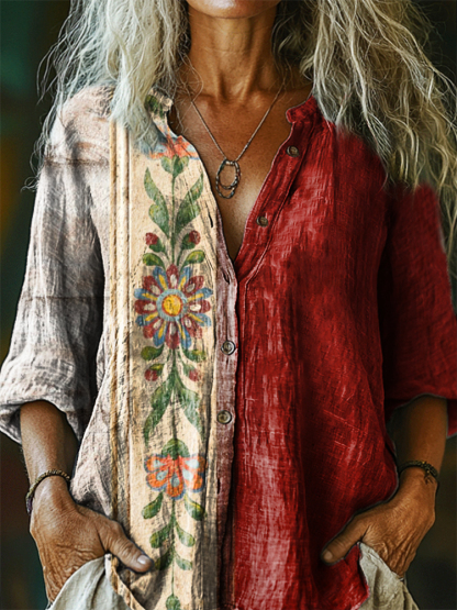 Women's Vintage Ethnic Floral Art Print Casual Cotton Linen Shirt