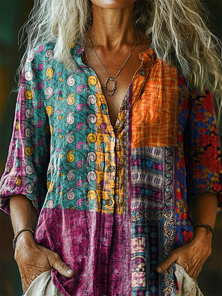 Women's Vintage Ethnic Floral Art Print Casual Cotton Linen Shirt