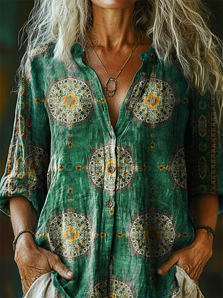 Women's Vintage Ethnic Floral Art Print Casual Cotton Linen Shirt