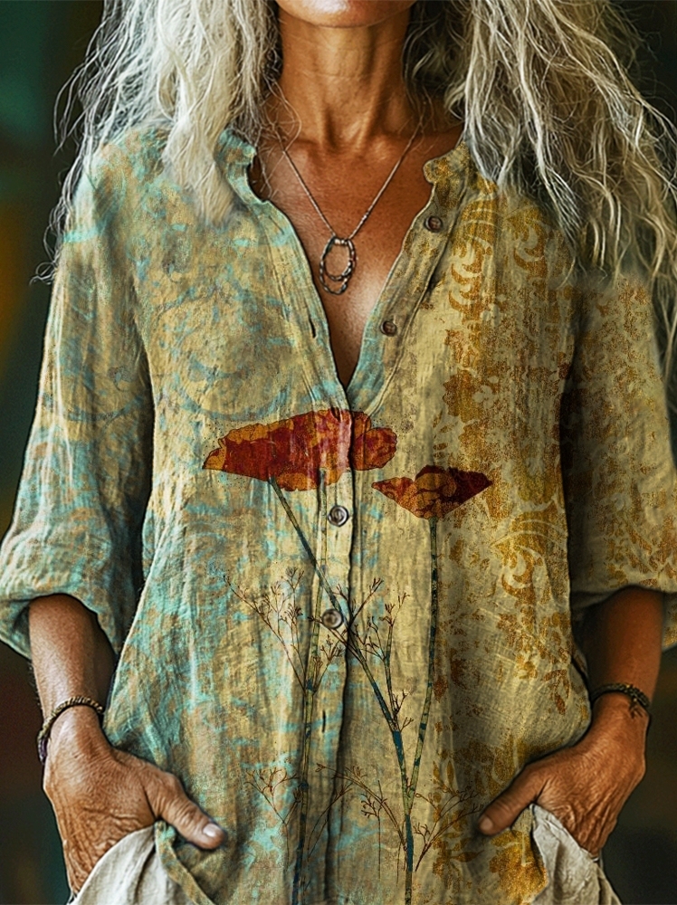 Women's Vintage Ethnic Floral Art Print Casual Cotton Linen Shirt