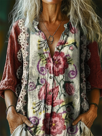Women's Vintage Ethnic Floral Art Print Casual Cotton Linen Shirt