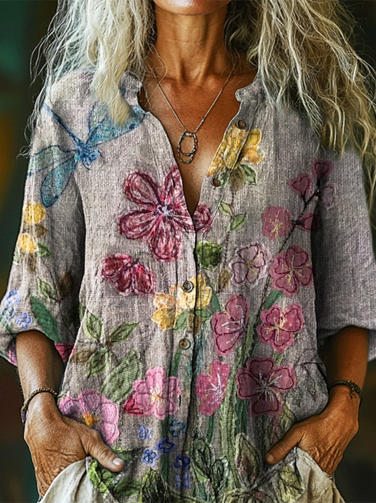 Women's Vintage Ethnic Floral Art Print Casual Cotton Linen Shirt
