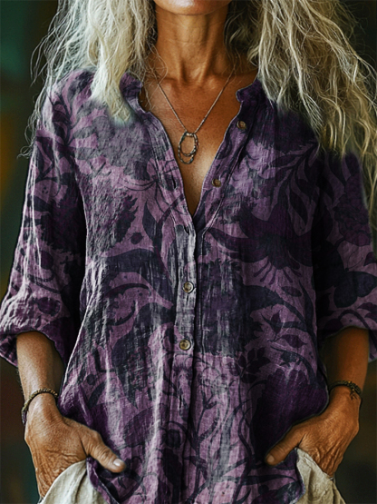 Women's Vintage Ethnic Floral Art Print Casual Cotton Linen Shirt