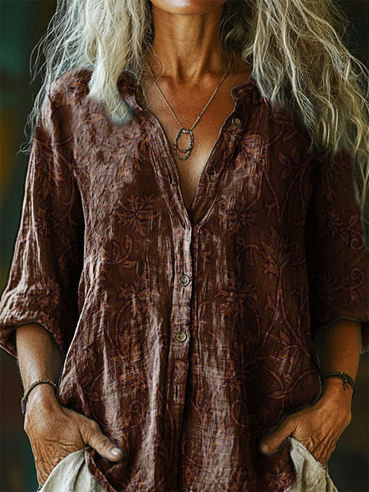Women's Vintage Ethnic Floral Art Print Casual Cotton Linen Shirt