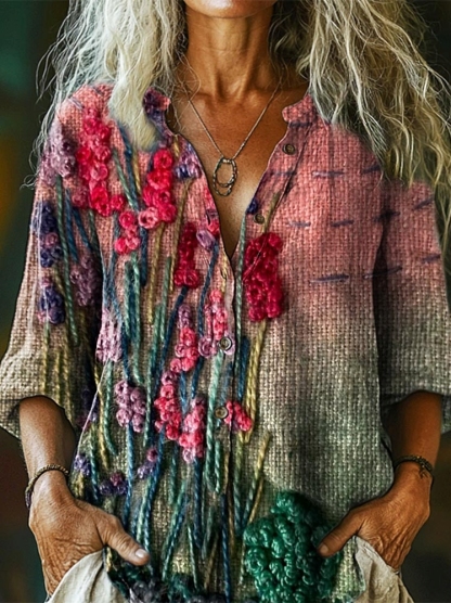 Women's Vintage Ethnic Floral Art Print Casual Cotton Linen Shirt