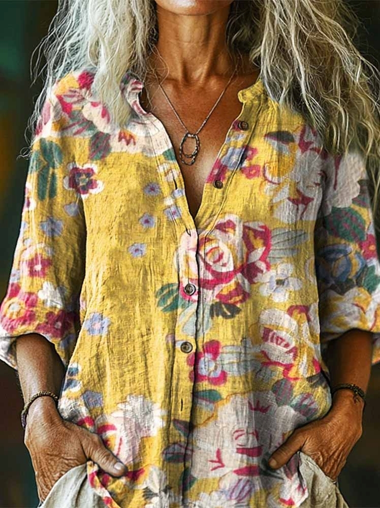 Women's Vintage Ethnic Floral Art Print Casual Cotton Linen Shirt
