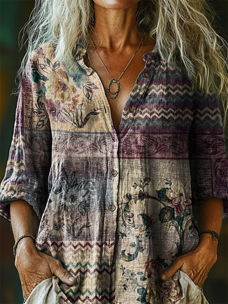 Women's Vintage Ethnic Floral Art Print Casual Cotton Linen Shirt