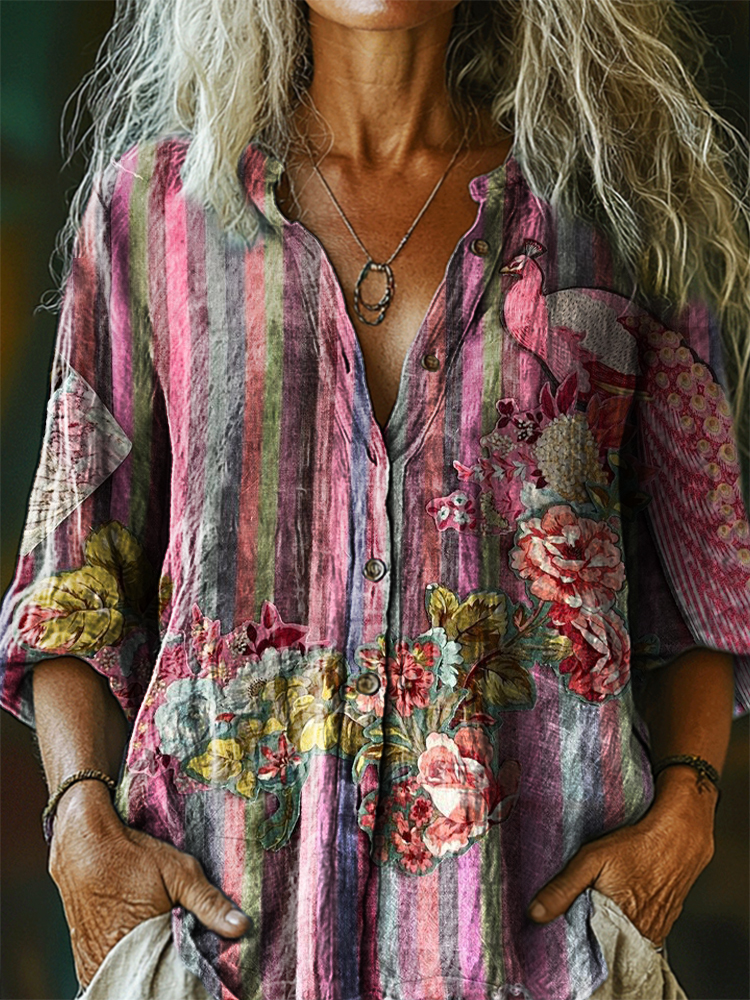 Women's Vintage Ethnic Floral Art Print Casual Cotton Linen Shirt