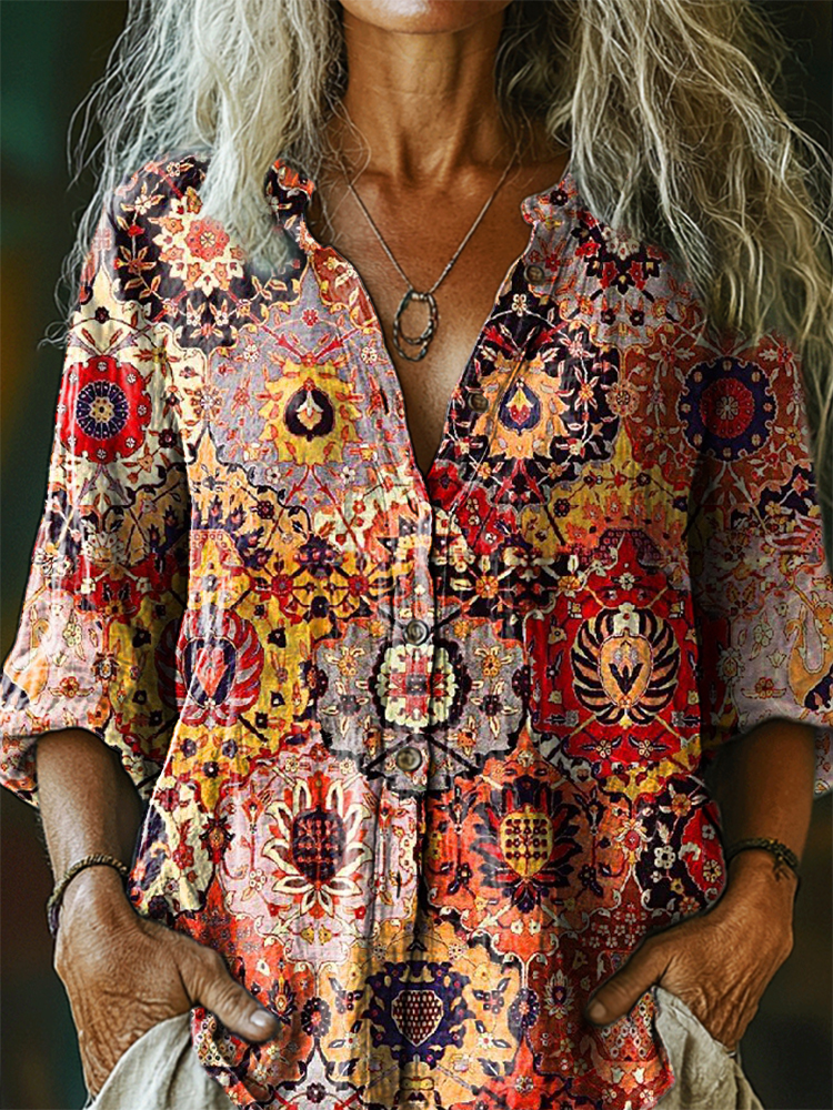 Women's Vintage Ethnic Floral Art Print Casual Cotton Linen Shirt
