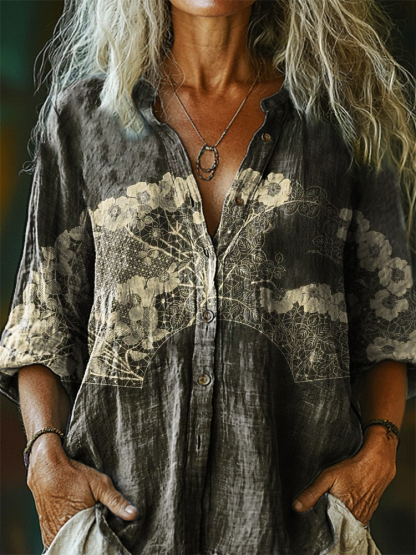 Women's Vintage Ethnic Floral Art Print Casual Cotton Linen Shirt