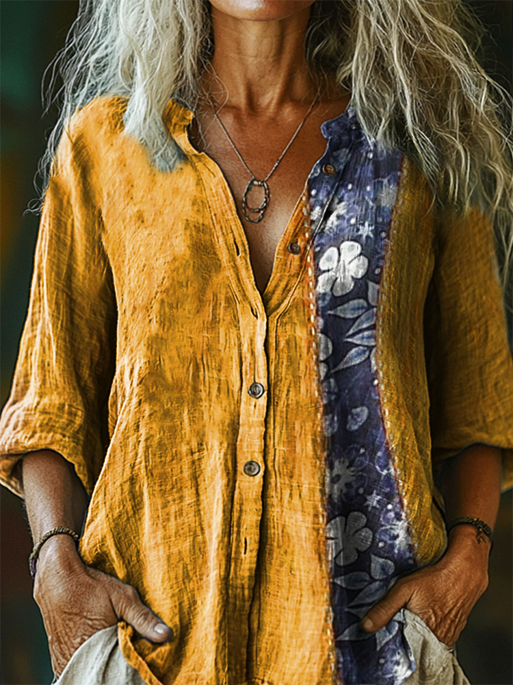 Women's Vintage Ethnic Floral Art Print Casual Cotton Linen Shirt