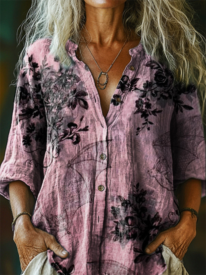 Women's Vintage Ethnic Floral Art Print Casual Cotton Linen Shirt