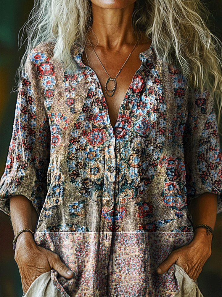 Women's Vintage Ethnic Floral Art Print Casual Cotton Linen Shirt