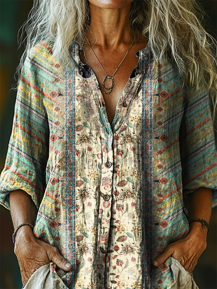 Women's Vintage Ethnic Floral Art Print Casual Cotton Linen Shirt