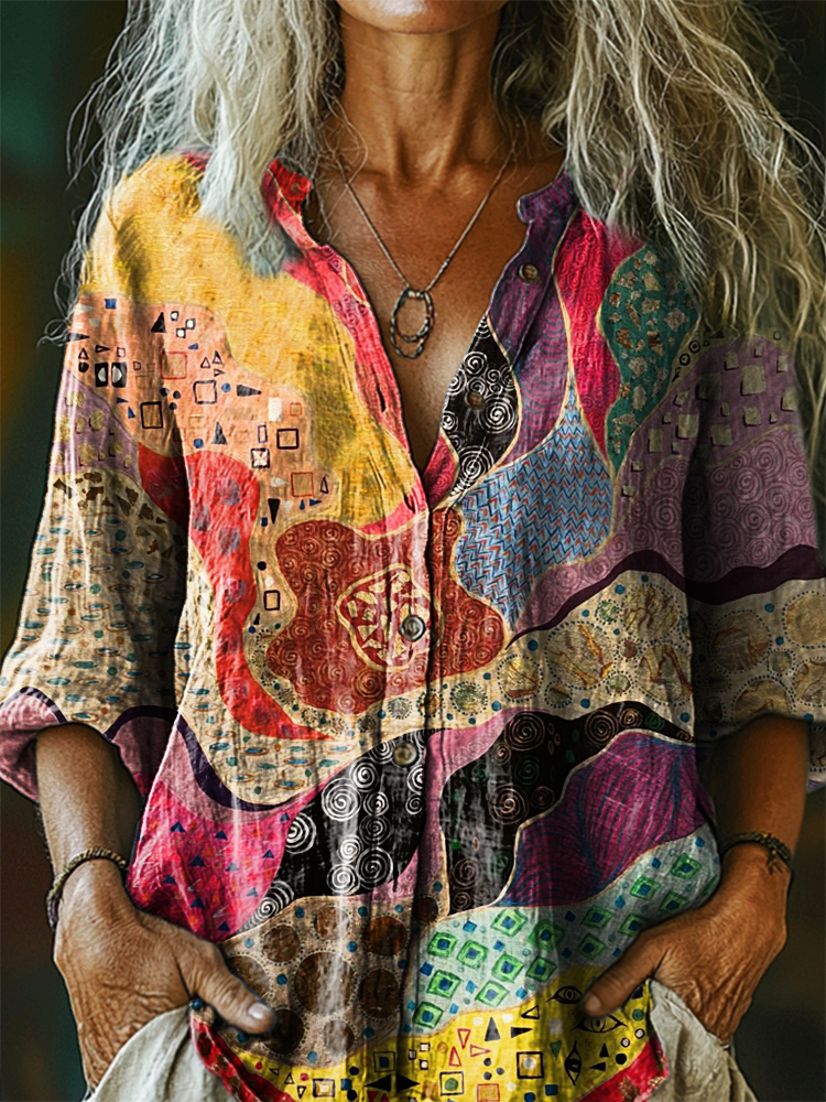 Women's Vintage Ethnic Floral Art Print Casual Cotton Linen Shirt