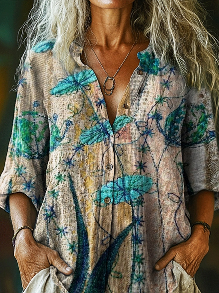Women's Vintage Ethnic Floral Art Print Casual Cotton Linen Shirt