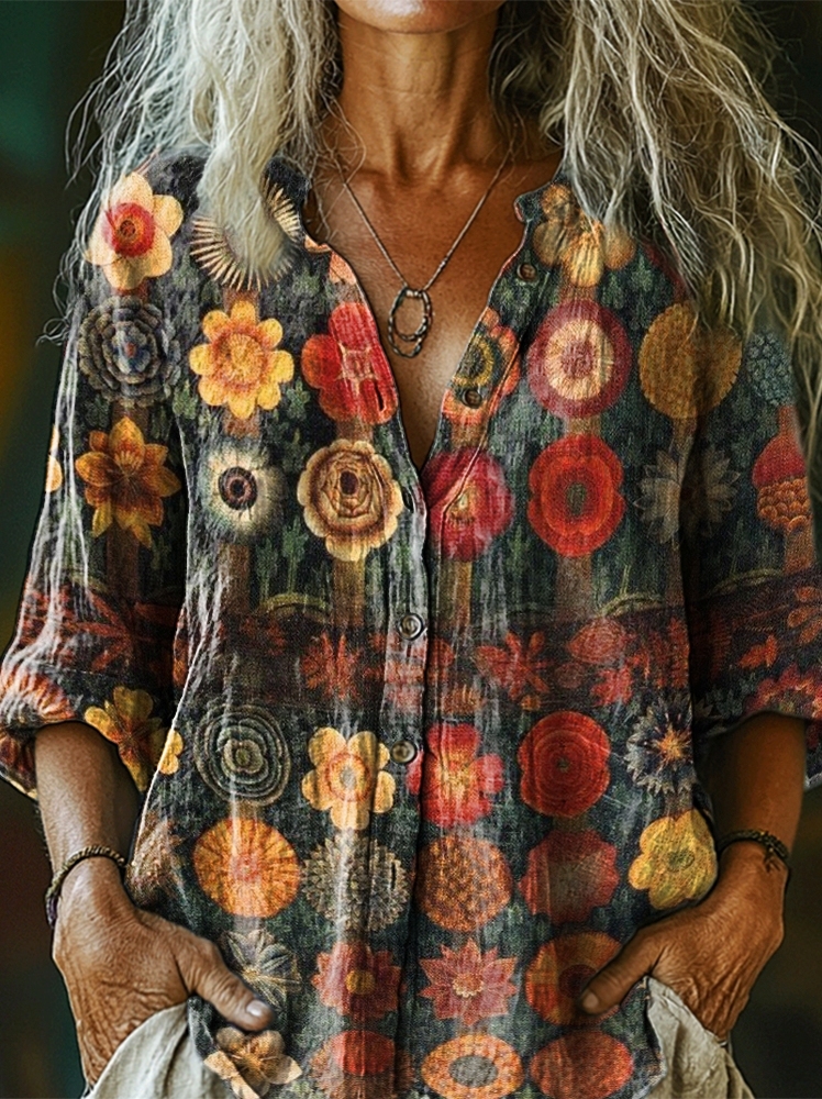 Women's Vintage Ethnic Floral Art Print Casual Cotton Linen Shirt