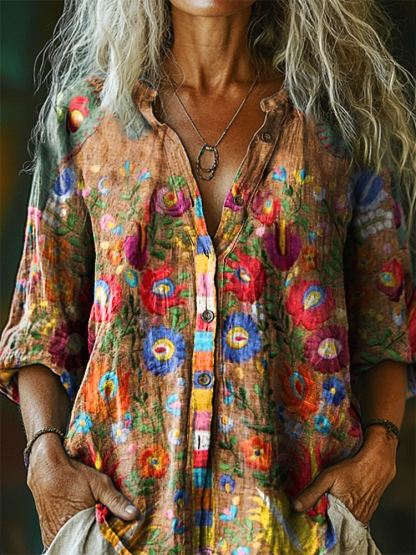 Women's Vintage Ethnic Floral Art Print Casual Cotton Linen Shirt