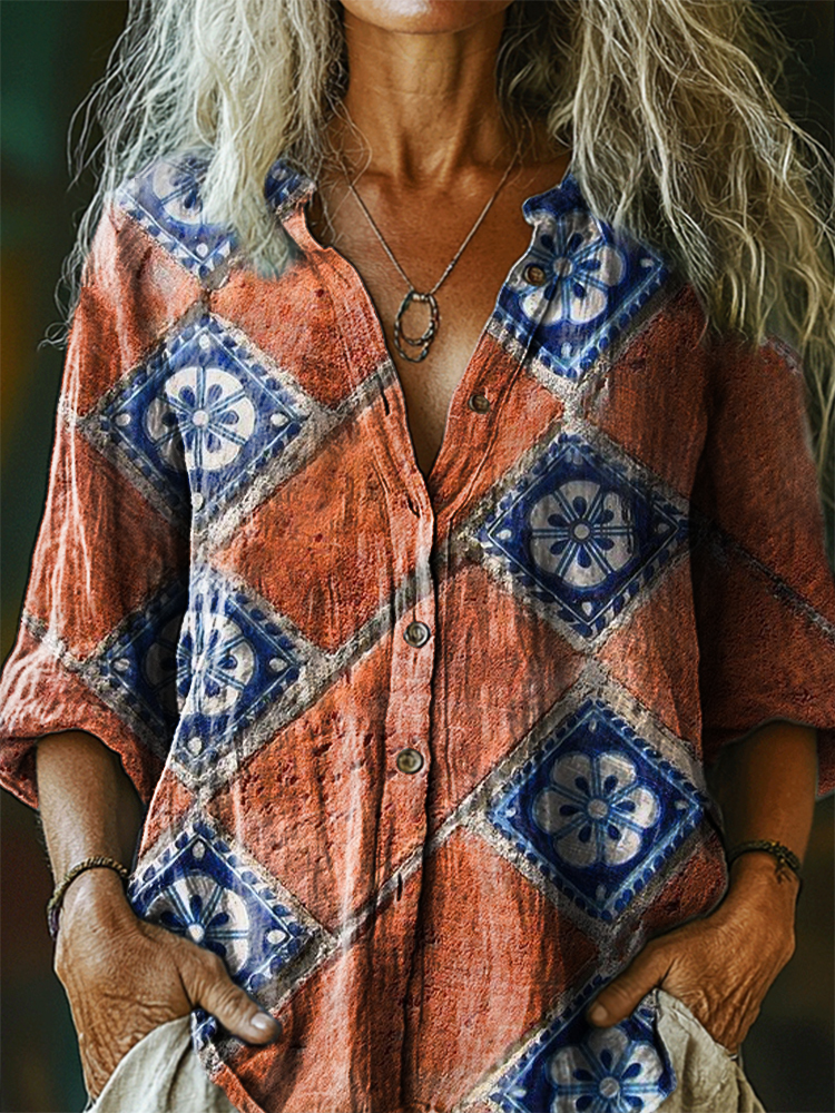 Women's Vintage Ethnic Floral Art Print Casual Cotton Linen Shirt
