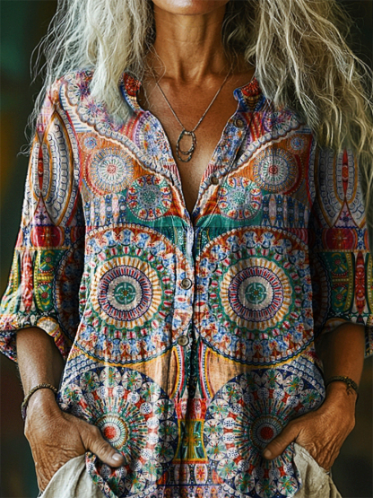 Women's Vintage Ethnic Floral Art Print Casual Cotton Linen Shirt