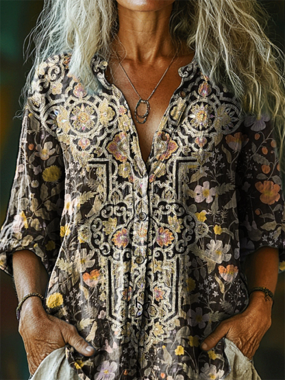 Women's Vintage Ethnic Floral Art Print Casual Cotton Linen Shirt