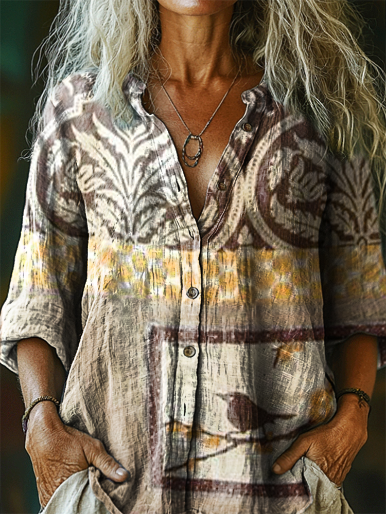 Women's Vintage Ethnic Floral Art Print Casual Cotton Linen Shirt