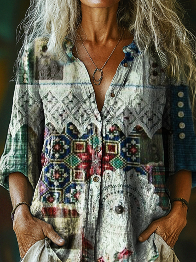 Women's Vintage Ethnic Floral Art Print Casual Cotton Linen Shirt
