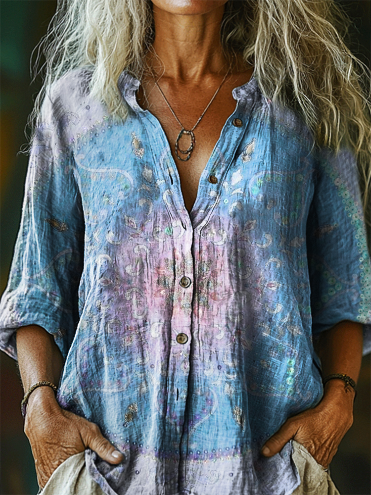 Women's Vintage Ethnic Floral Art Print Casual Cotton Linen Shirt