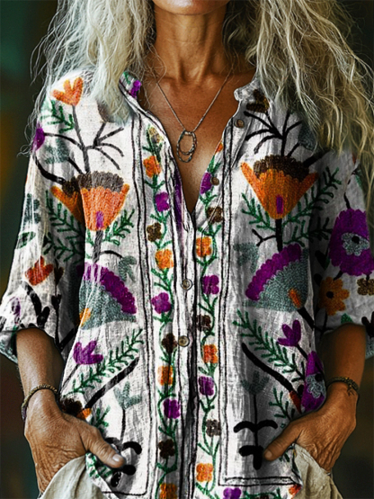 Women's Vintage Ethnic Floral Art Print Casual Cotton Linen Shirt