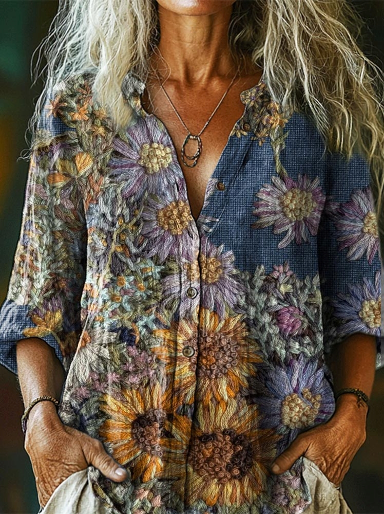 Women's Vintage Ethnic Floral Art Print Casual Cotton Linen Shirt