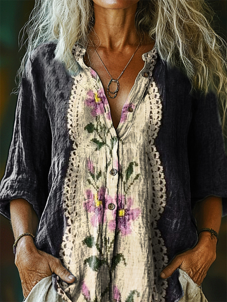 Women's Vintage Ethnic Floral Art Print Casual Cotton Linen Shirt