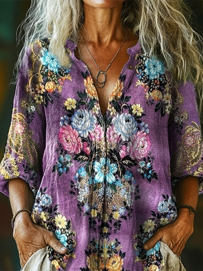 Women's Vintage Ethnic Floral Art Print Casual Cotton Pocket Shirt