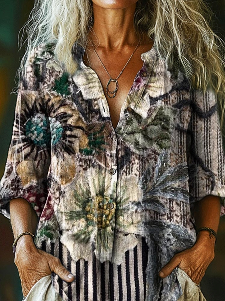 Women's Vintage Ethnic Floral Collage Art Print Casual Cotton Linen Shirt