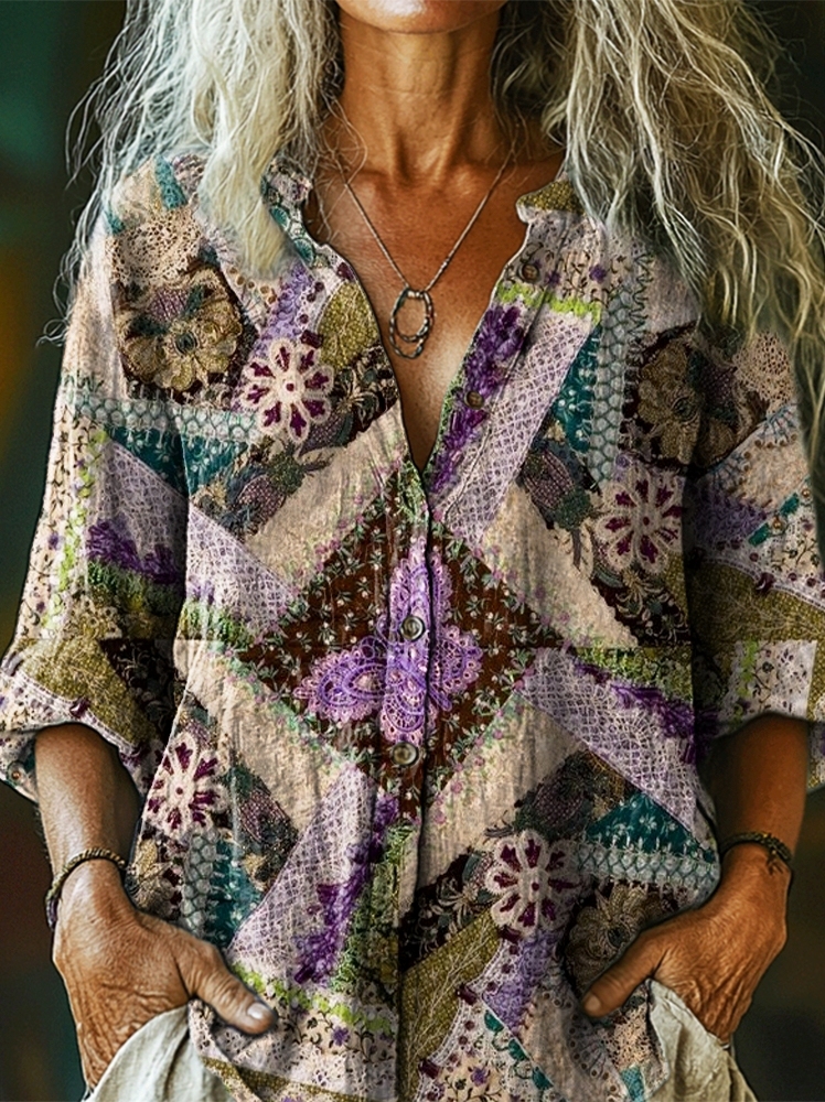 Women's Vintage Ethnic Floral Collage Art Print Casual Cotton Linen Shirt