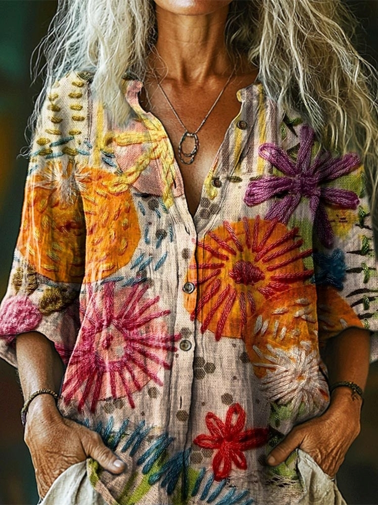 Women's Vintage Ethnic Floral Collage Art Print Casual Cotton Linen Shirt