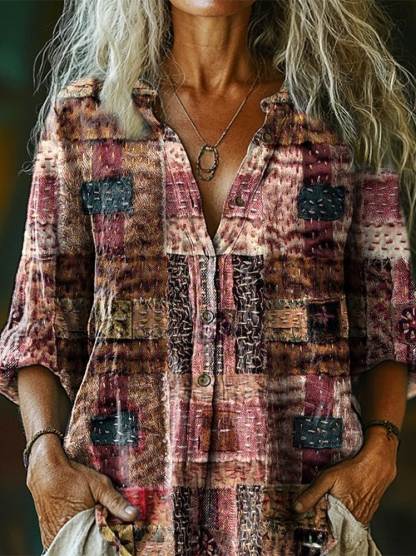 Women's Vintage Ethnic Patchwork Art Print Casual Cotton Linen Shirt