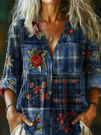 Women's Vintage Faux Denim Patchwork Art Print Casual Cotton Linen Shirt