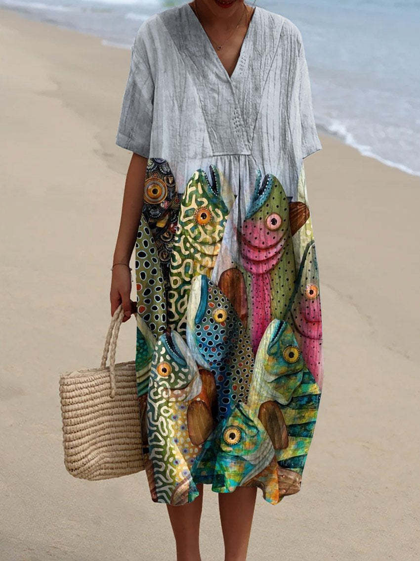 Women's Vintage Fish Art Print Flowy Dress
