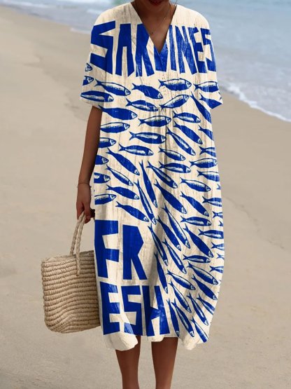 Women's Vintage Fish Sardines Art Print Flowy Dress