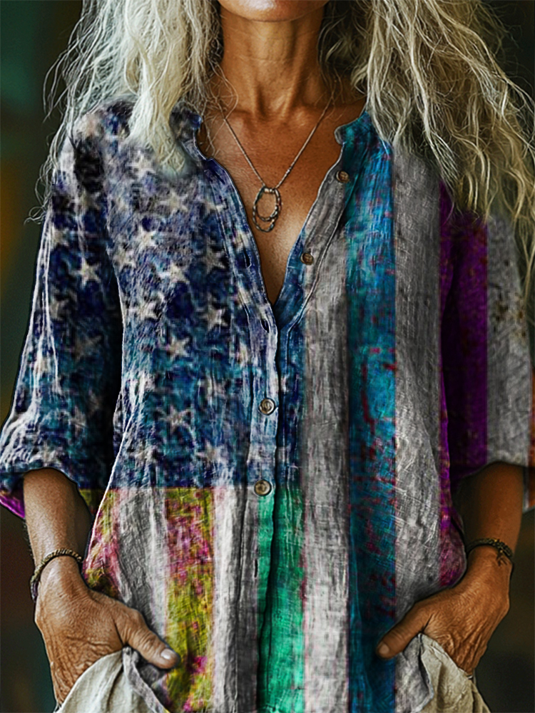 Women's Vintage Flag Art Print Casual Cotton Linen Shirt