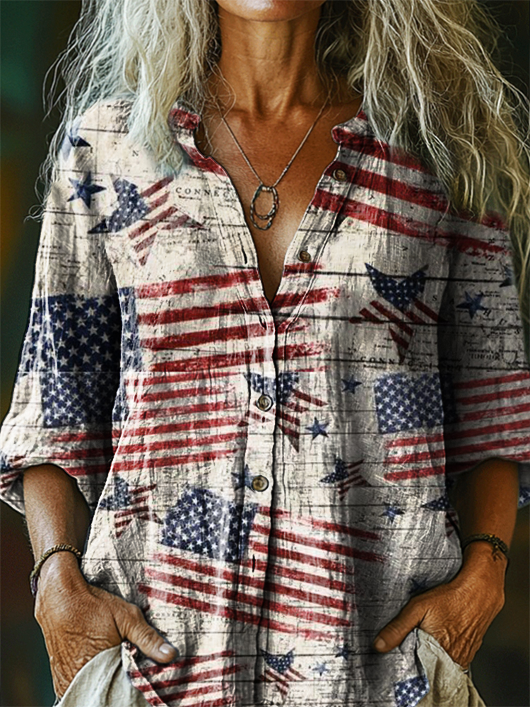 Women's Vintage Flag Art Print Casual Cotton Linen Shirt
