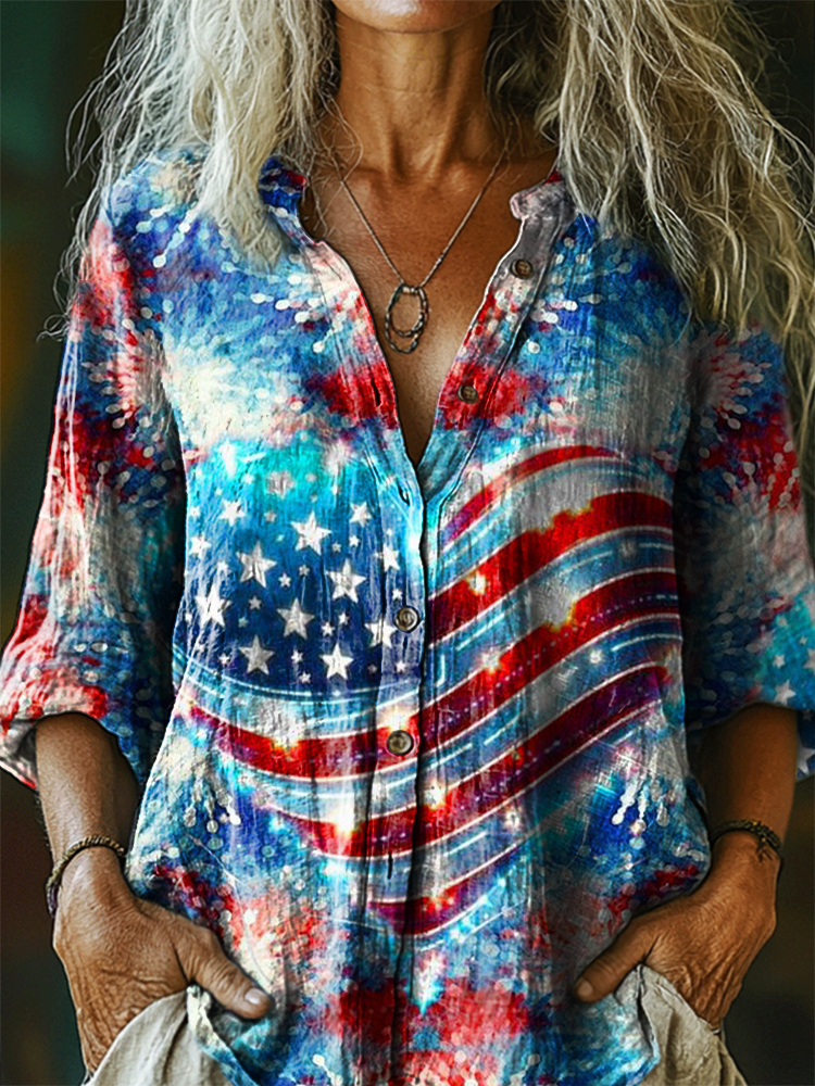 Women's Vintage Flag Love Art Print Casual Cotton Linen Shirt
