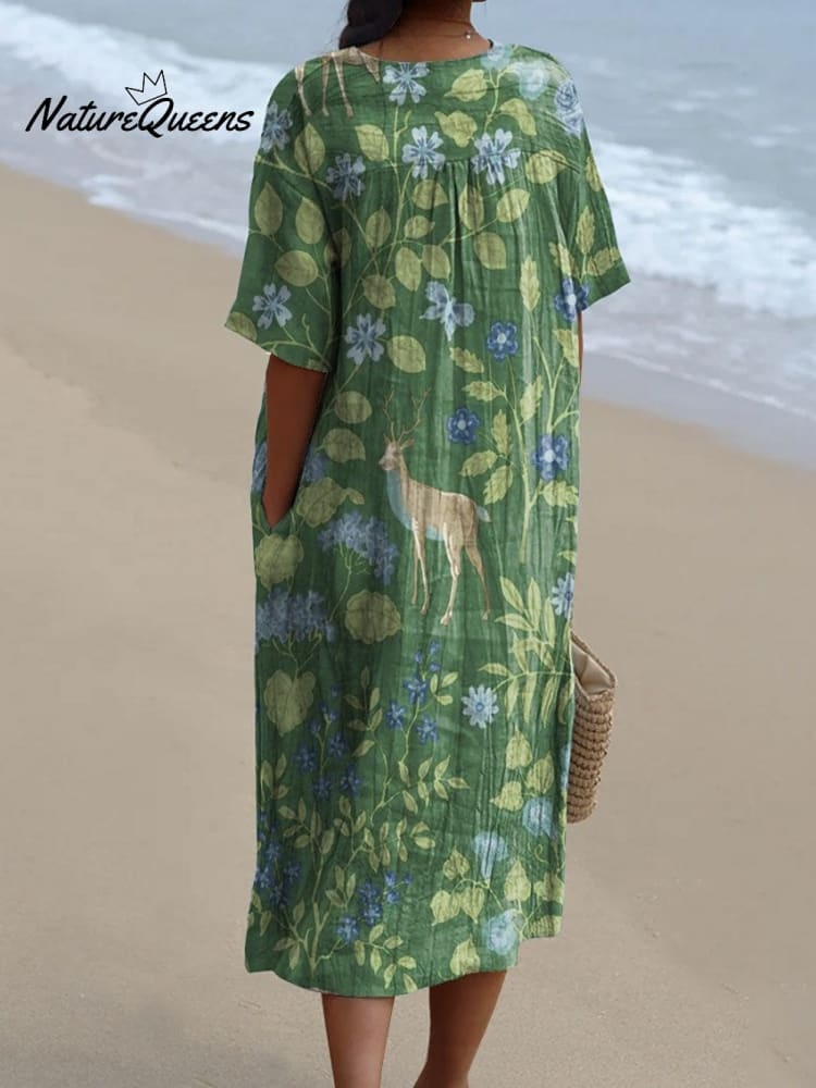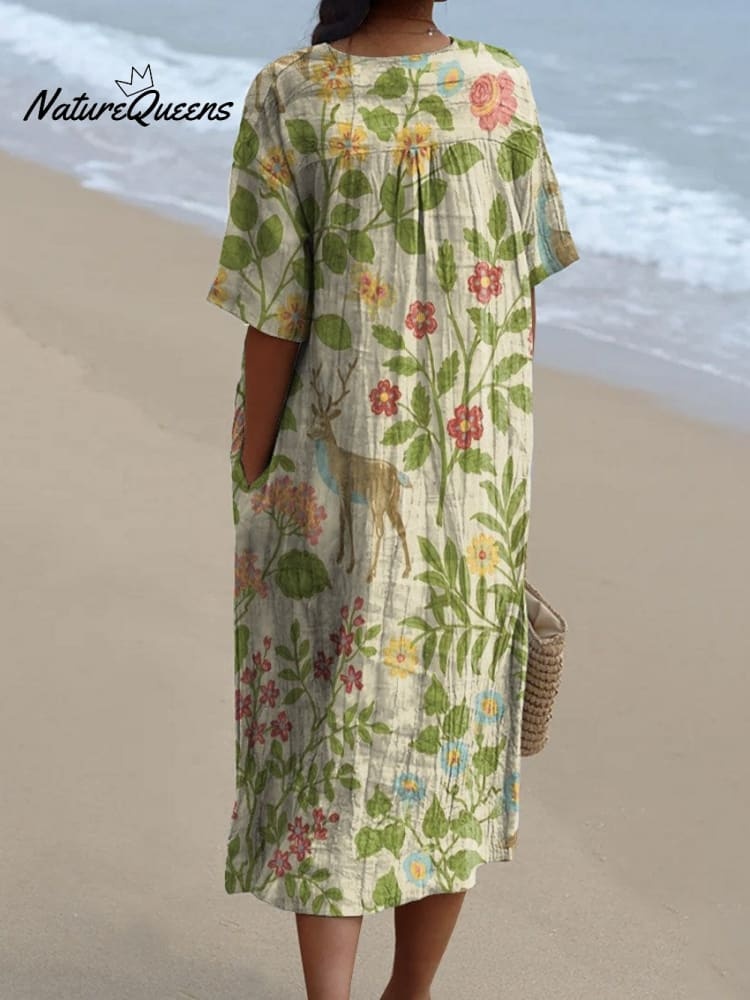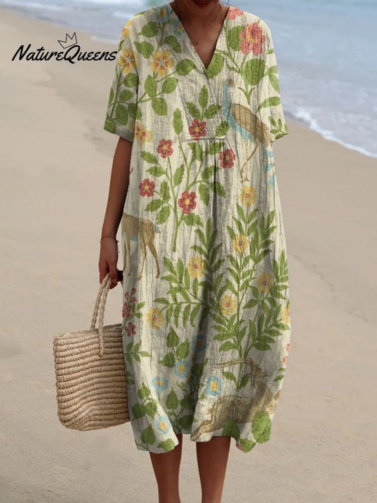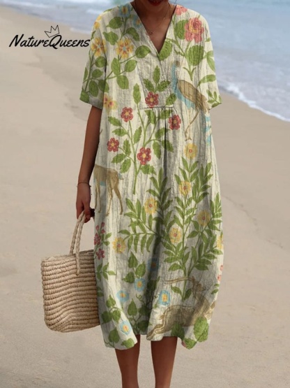 Women's Vintage Floral Animals Art Print Flowy Dress