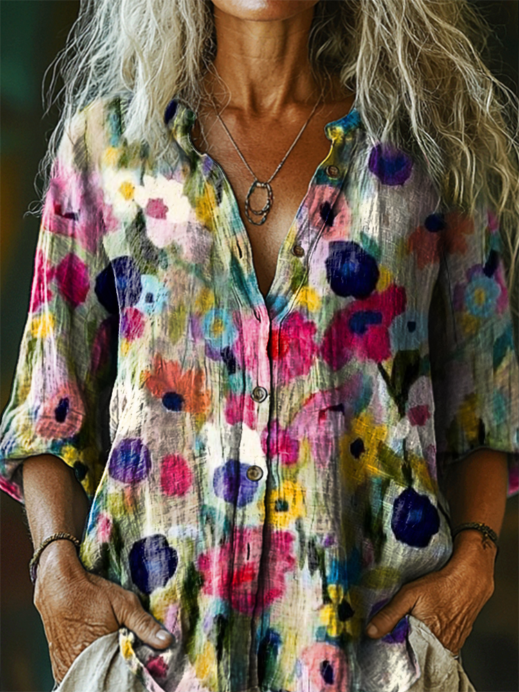 Women's Vintage Floral Art Print Casual Cotton Linen Shirt