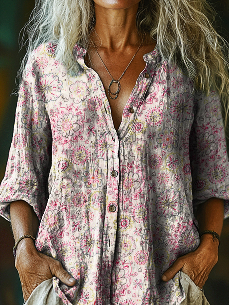 Women's Vintage Floral Art Print Casual Cotton Linen Shirt